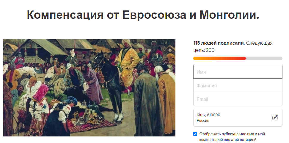 Автор петиции, Олег Мишкин, от имени «всех потомков русичей» потребовал, чтобы правительство Монголии вернуло им «все выплаты» дани «за 240 лет», что длилось ордынское иго.
