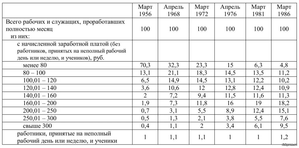 Оставим в покое 50-е и даже 60-е годы; идем сразу в "золотой век", в 70-е-начало 80 х. В 1972 году, менее 80 рублей в месяц в СССР получало 23,3%. Почти каждый пятый. Да еще 18,3% получали от 80 до 100 рублей. И это-обратите внимание-"без работников, принятых на неполный рабочий день или неделю, и учеников".А если еще и этих включить в статистику, то в 1972 году более 60% работающих получали меньше 100 рублей в месяц.
