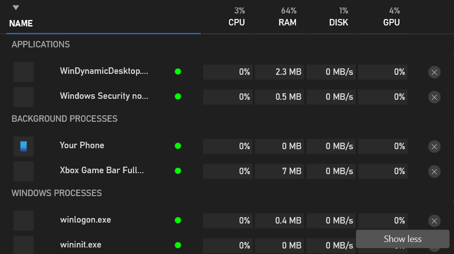 Вы можете отфильтровать список процессов по значениям потребления и завершить работу нежелательных процессов, нажав кнопку «X».