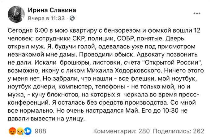 Если честно, то я в шоке... Неужели больше нет других способов бороться против фальсификаций на выборах во время голосования? Неужели больше нет других способов бороться за свободу слова? Почему на кон должна быть поставлена человеческая жизнь? Почему? Почему журналистка Ирина Славина была доведена до отчаяния? Не выдержала репрессий и унижения силовиков? Не выдержала нарушения её прав и свобод, ведь при обыске у неё дома ей даже не позволили вызвать адвоката... Разве это не является нарушением нашего российского законодательства? Разве нет в этих действиях нарушения главного закона нашей страны Конституции РФ?