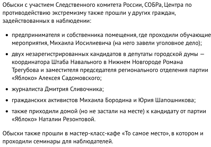 Поводом для обысков стали тренинги движения «Голоса» для наблюдателей, которые нижегородская полиция пыталась сорвать еще 8 и 9 сентября – накануне старта досрочного голосования (единый день голосования был 13 сентября 2020 года). Проведение этих тренингов позднее стало приписываться «Открытой России», хотя организация Михаила Ходорковского не имела к ним ни малейшего отношения. Более того, отделения «Открытой России» вообще нет в Нижнем Новгороде.