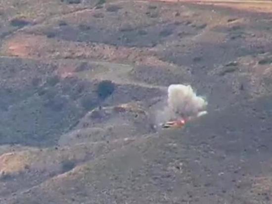 На кадрах видно, как реактивный снаряд попадает в армейский грузовик, который едет по горной дороге. После попадания машина взрывается.