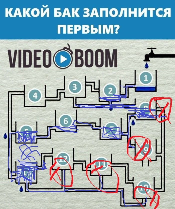 Да что-ж такое-то?))) Ну посмотрите внимательно)) колено от от 8 бака к 7 расположено ниже, чем от 8 к 10 и к тому-же там тоже перемычка. Вода дойдет до колена к 7 и пойдет по указанному мной пути. 10 не заполнится вообще, ни на чуть-чуть. Потому что у 9 перемычка в той трубе, что связана с 8))). Вода течёт вниз. Ну ё-моё)).