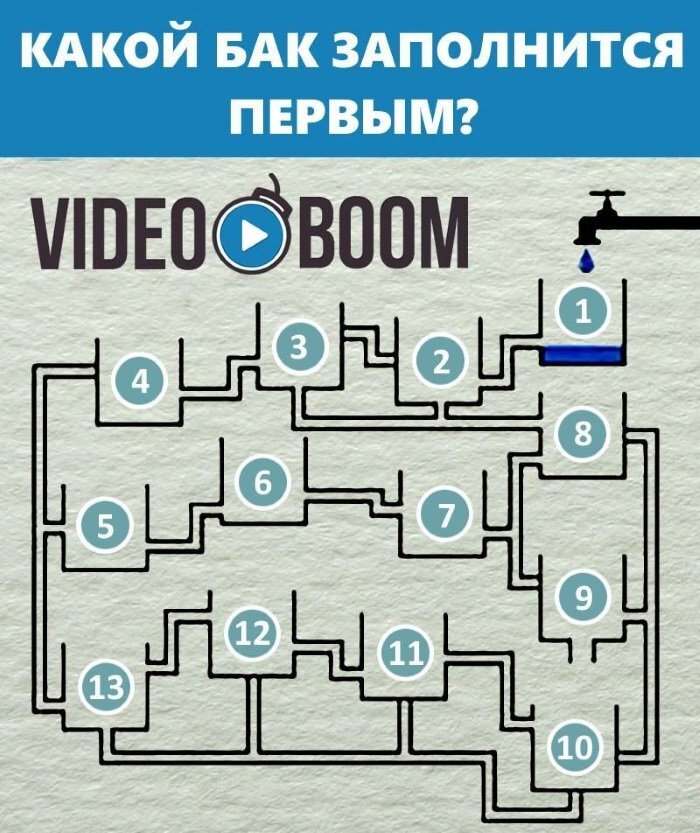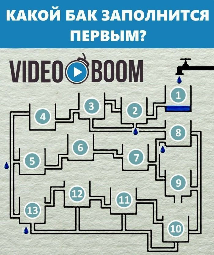 Подвох в перемычках, бак 10 наполнится первым. Чтобы 13 бак заполнился, должен заполнится бак 10,из которого вода не вытекает, потом 11 и 12 баки, и только потом заполнится 13 бак.