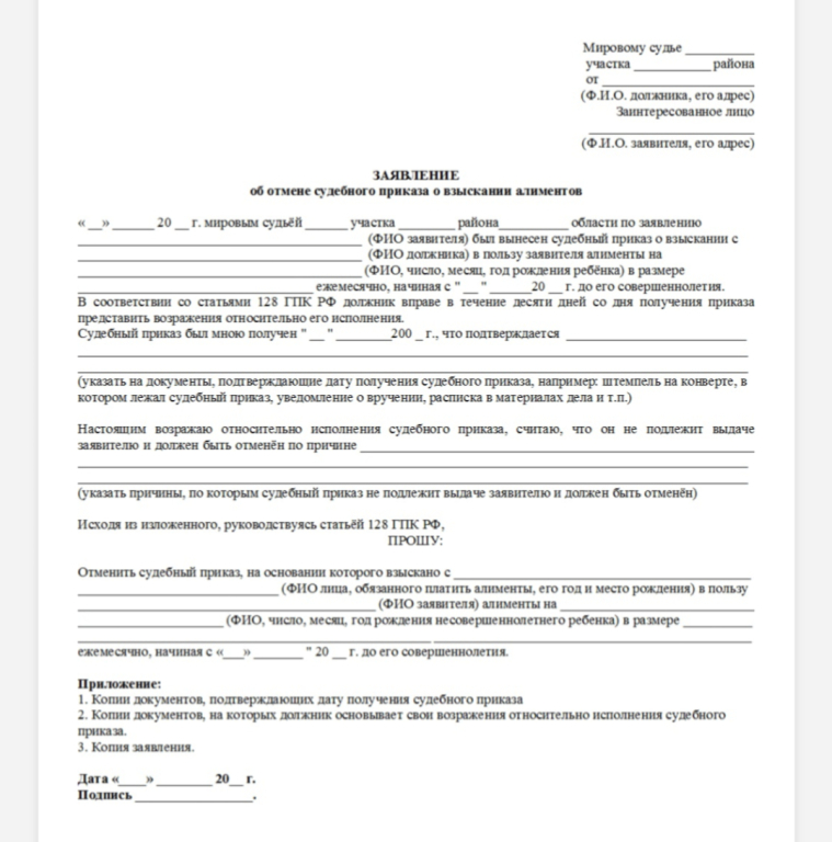 Отмена судебного приказа, например, о взыскании алиментов, вступившего в законную силу осуществляется при условии, если лицо не пропустит отведенный на это срок и напишет возражение, в котором укажет, что желает отменить определенный приказ. Срок на обжалование – 10 дней.