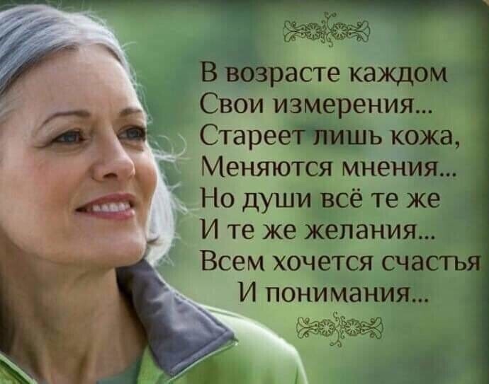 Можно в 18-20 старухой быть и в 50 стройной, умной, жизнерадостной. На сколько себя чувствуешь - на столько и выглядишь. Моей соседке 71, шустра.