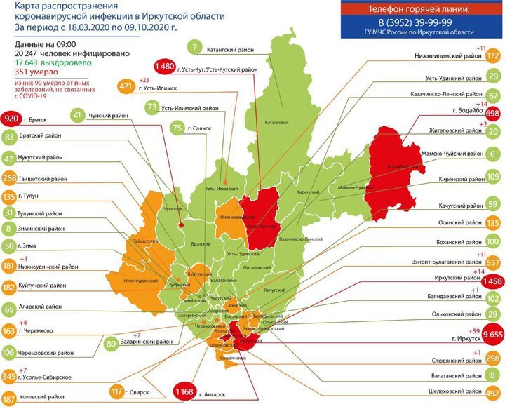 По данным регионального оперштаба на 9 октября, количество подтвержденных случаев COVID-19 в Иркутской области выросло до 20 247. Суточный прирост составил 155 человек. От коронавируса умер 261 пациент, от иных заболеваний, не связанных с инфекцией, — 90.