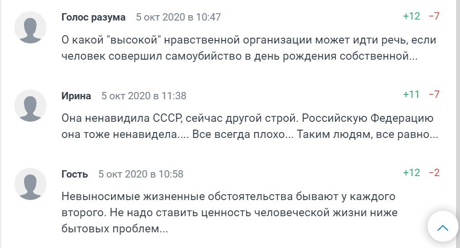 Но особенно меня впечатлил посыл психиатра Сиволапа о том, что самоубийство это удел людей гораздо более высокой нравственной организации чем индивиды простого разбора, неспособные повторить "подвиг" Славиной.