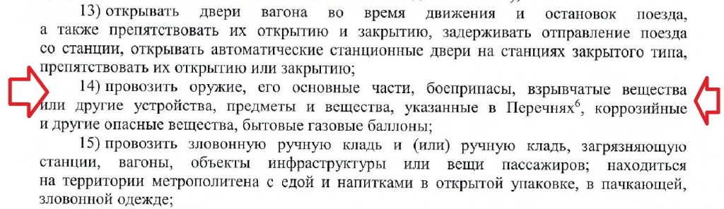 пп. 14) провозить оружие, его основные части, боеприпасы, взрывчатые вещества или другие устройства, предметы и вещества, указанные в ПеречняхОб утверждении Правил пользования Петербургским метрополитеном, коррозийные и другие опасные вещества, бытовые газовые баллоны;