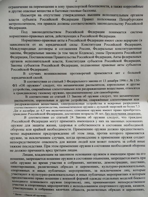 Итог: в пунктах написано ЗАПРЕЩЕНО провозить ТОЛЬКО НЕлегальное оружие о чем гласят приписки "без законных оснований", "без правовых оснований", "без специального разрешения", "при нарушении правил" и т.д. ЛЕГАЛЬНОЕ ЗАКОННОЕ ОРУЖИЕ - транспортировать разрешено: гладкоствольные ружья, газовые баллончики, травматическое оружие, электрошокеры и тд (ст 3 и 13 ФЗ об оружии). ГАЗОВЫЕ БАЛЛОНЧИКИ - относятся к оружию и лицензированию не подлежат. ПРИ НЕДОПУСКЕ в метрополитен - требуйте составления" Акт