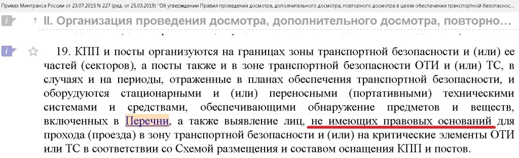 2. пункты 13, 19, 37, 61 (перечень) , 64 (про АКТ в 2 экз.) , абз. 5 п. 67 Приказа минтранса 227 в этих пунктах везде отмечается "без правовых оснований", "Без законных оснований" "без разрешений"
