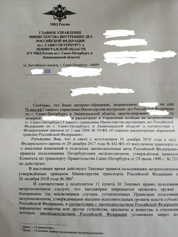 Причем по смыслу всего гражданского оружия и тут ссылки на федеральные законы не помогут. Т.к. Контролеры СКМ и инспекторы на станциям впервую очередь будут руководствоваться этим пунктом и всех с оружием выгонять с метро.