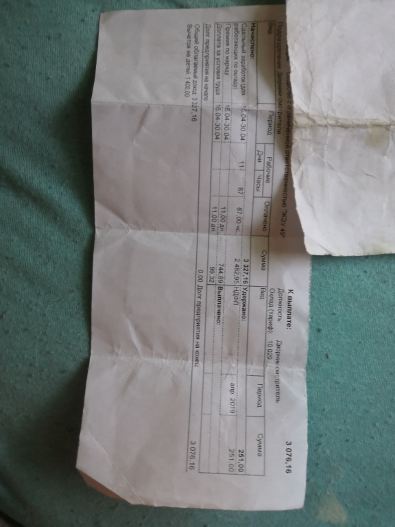. "Президент сказал". Ага, сказал, только местечковым князьям на это - фиолетово. Президент далеко, а начальник - в соседнем доме. Повторяю - всё это туфта. Может для "центра", но всяко - не для регионов. Попробую загрузить "расчётку одного сослуживца, закрыв ф. и. о.., там видно, за 11 рабочих дней заплатили 3 076,16 рублей, путём рассчётов получаем, одна смена - оплата 279,64 рубля, 21 смена в месяц, получаем оплату 5 872,37 рубля, примерно. То есть человек не получает даже 6 тыс. рублей. А псалмы поёте господа чиновники о каких то зарплатах. Свою, часом не спутали с нашей?