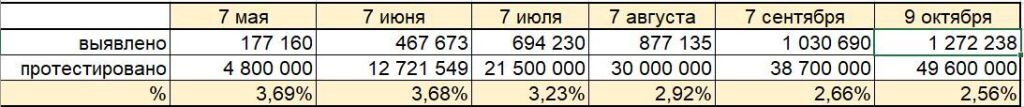 А теперь попробуем взглянуть на все иначе. Интересный сайт приводит сводную статистику выявленных больных коронавирусом и количество тестов по стране на любую дату, в том числе нарастающим итогом. Получается картинка с прямо противоположным посылом, а именно: с течением времени и ростом числа тестируемых процент выявленных заболевших ПАДАЕТ.