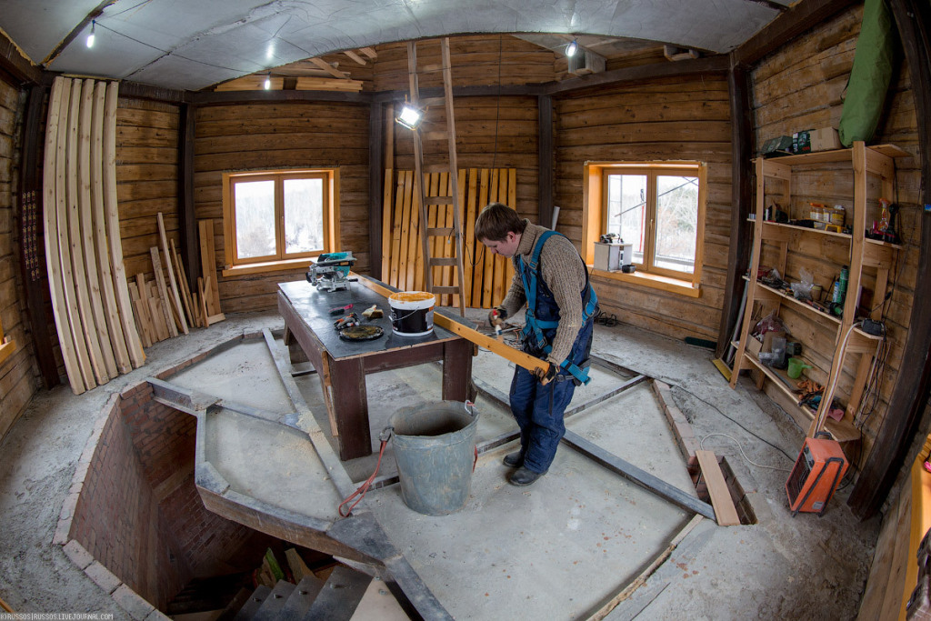 Работы в башне ведутся с 2013 года. Сначала Александр трудился один, потом у него появился постоянный работник по имени Павел, он уже три года занимается внутренней отделкой помещения.