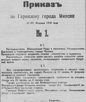 Многое в ХХ веке начиналось с инициативных интеллигентов-фантазёров. История создания БНР здесь не исключение. В начале ХХ века на общей революционной волне в огромной массе всевозможных социалистов выявились и так называемые национальные социалистические революционные партии и движения. Одна из первых и наиболее известных - еврейский Бунд (с немецкого или идиш переводится как "союз"). Области, именовавшиеся когда-то Белой Русью, а потом входившие в состав Белорусской губернии Российской империи, и население их не избежали этого поветрия. В 1903 году возникает Белорусская революционная громада, которая во время событий 1905 - 1907 гг. возьмёт новое название - Белорусская социалистическая громада. Это была не единственная националистическая организация социалистической направленности, но она стала объединительной площадкой для многих подобных ей групп. После Февральской революции 1917 года бывшая Российская империя всё более погружалась в состояние хаоса. Летом назрел жесточайший правительственный кризис. И в это же время возникшие как результат революционной волны органы власти многих территорий России пытаются заявить о своей готовности к политической автономии. По инициативе Белорусской социалистической громады на съезде националистических организаций была образована Центральная Рада (Центральный Совет). Но реальной власти в руках у этого органа не оказалось. В ноябре 1917 года после победы большевиков в Петрограде в самом начале триумфального шествия советской власти по стране в Минске на съездах местных Советов был образован Исполнительный комитет Советов рабочих, солдатских и крестьянских депутатов Западной области и фронта (Облисполкомзап) и Совет народных комиссаров (СНК) Западной области. Действовали Исполком и СНК на основе тех декретов, которые принимала Советская власть в Петрограде. На основании Декрета о земле началось закрепление конфискованных помещичьих земель за белорусскими крестьянами. А Центральная Рада, переименовав себя в Великую Белорусскую Раду, не подчинилась власти Советов и сделала попытку захвата власти с помощью созываемого Первого Всебелорусского съезда. Поскольку съезд был разогнан большевиками и их союзниками, надежды на власть отодвинулись. Но белорусских националистов выручило немецкое наступление в феврале 1918 года. В преддверие вступления немцев в Минск 21 февраля 1918 года 1-й Уставной грамотой Исполком Рады Всебелорусского съезда объявил себя властью в крае и образовал правительство (Народный секретариат). Созданная ещё Первым всебелорусским съездом в декабре 1917 года Рада Белорусской Народной Республики (БНР) после оставления большевиками г. Минска объявила себя высшей властью на территории Белоруссии. 25 марта 1918 года при поддержке немецких оккупационных властей 3-й Уставной грамотой Белоруссия провозглашалась независимым и свободным государством. Так возникла Белорусская Народная Республика (БНР). Глава Центральной Белорусской Войсковой Рады (громкое название, на самом деле это всего лишь несколько человек, провозгласивших перед своим арестом большевиками создание национальной армии) Константин Езовитов, назначенный накануне вступления немцев в Минск комендантом города, издал приказ с призывом о мирном отношении к немецким солдатам и офицерам.