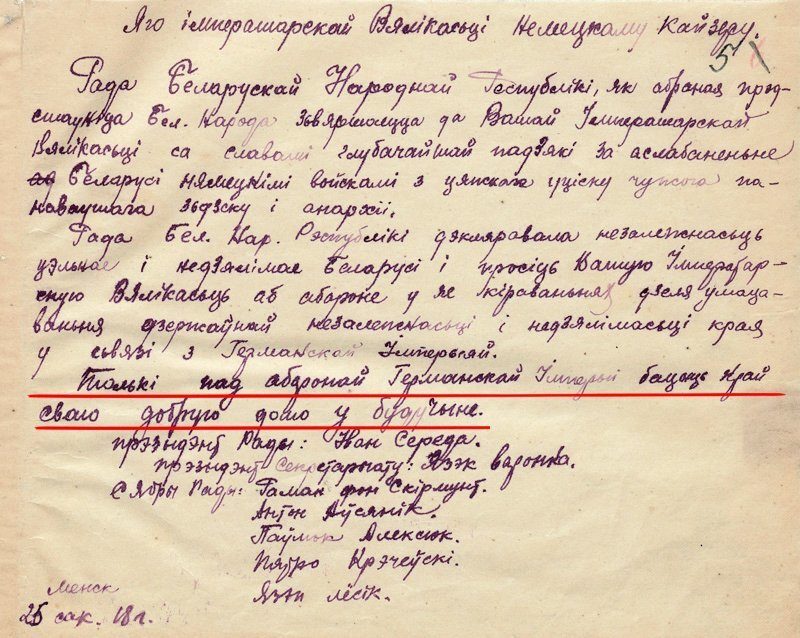 25 апреля 1918 года Рада Белорусской Народной Республики отправила приветственную телеграмму кайзеру (императору) Германии Вильгельму II, в которой в подобострастных выражениях благодарила немецкую армию за освобождение белорусского народа и страны "из-под тяжёлого гнёта чужого господствующего издевательства и анархии". Этот акт способствовал разладу в верхах БНР и выходу из состава правительства некоторых его крайне левацки настроенных членов.