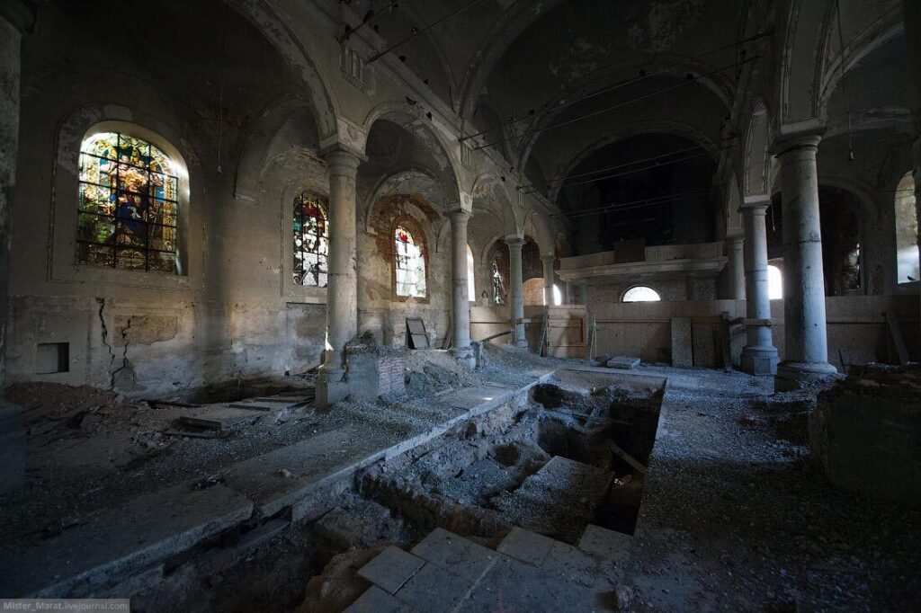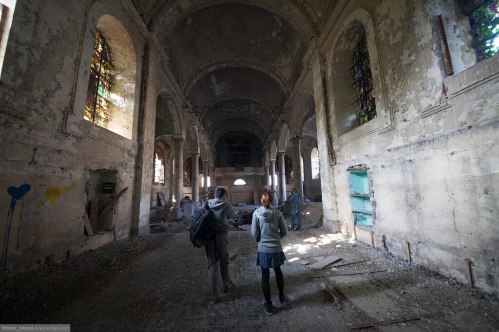 Объект называется так, что это-сплошное минное поле, которое облюбовали птички. Ничего особенного здесь нет, кроме сохранившихся витражей. Однако общее состояние здания было самым худшим среди всех ранее показанных заброшенных зданий.