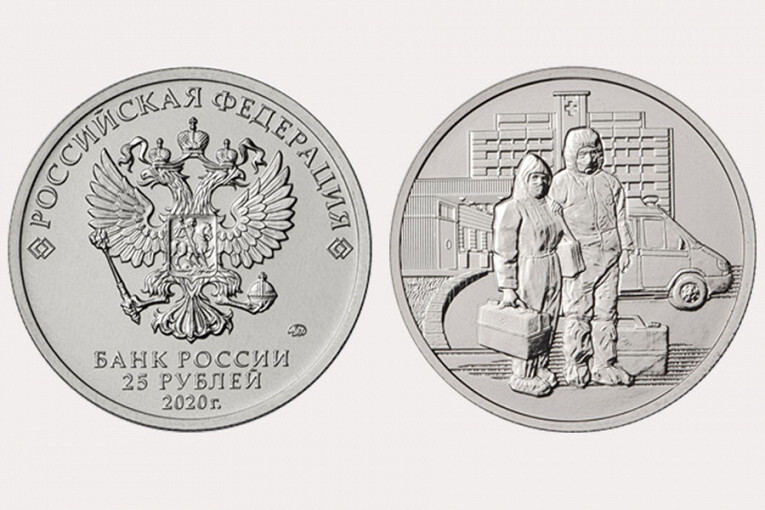 Пандемия коронавирусной инфекции COVID-19, в разгар которой выпущена новинка, на монете не упоминается. Однако на реверсе монеты изображены два медика (женщина и мужчина) в защитных костюмах, которые обычно носят те, кто работает с больными COVID-19. Врачи стоят на фоне здания больницы и машины скорой помощи.