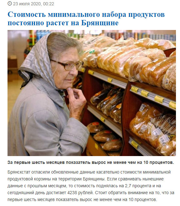 Все, плановое закончилось... рыночные отношения, цены никто никогда не сможет гарантировать... Брянская обл. пенсионеры корзина: пенсионеры 8200, дети 9900... работающие 10800... МРОТ всегда выше был. И что это за призрачная корзина..201 яйцо на год...0,5 яйца в день... 18 кг рыбы на года... хрень на постном масле, как и с объемами, так и, соответственно с ценами.