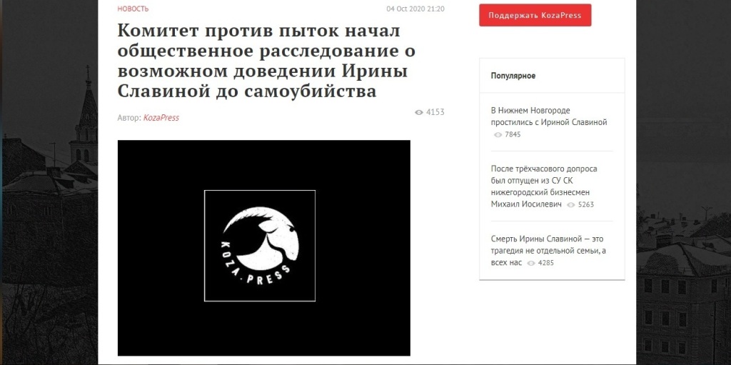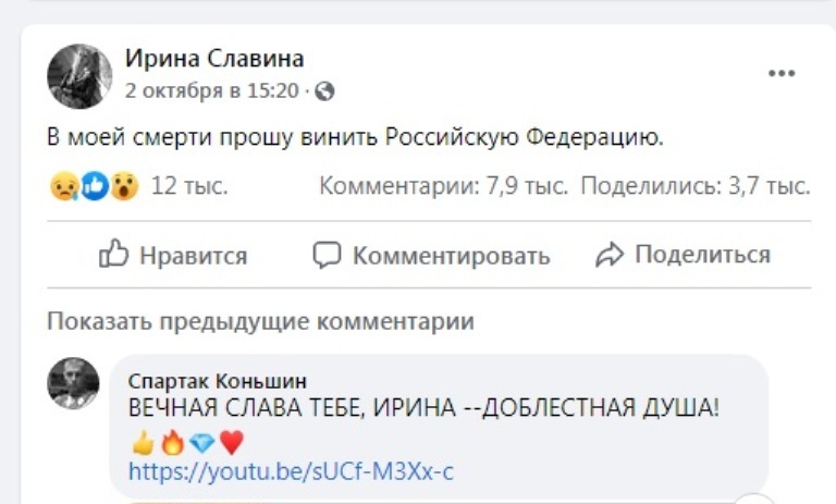 2 октября 2020 года у здания главного управления МВД России по Нижегородской области подожгла себя главный редактор Интернет-издания Koza.Press Ирина Славина, а точнее Мурахтаева Ирина Вячеславовна. В результате этого Славина Ирина скончалась на месте. Её имя не настолько было известно по всей России и за её пределами, но достаточно известно в Нижегородском регионе и не только. По крайней мере её самоубийство вызвало реакцию у какого-то бесконечного множества либеральных деятелей всех сортов и мастей, возможно, большинство из них до этого случая ничего о Славиной и не знали. В объяснение своего поступка на своей странице в соцсети Facebook**** она оставила такой пост: "В моей смерти прошу винить Российскую Федерацию". Вот так, ни больше, ни меньше! Вся страна виновата и никак иначе!