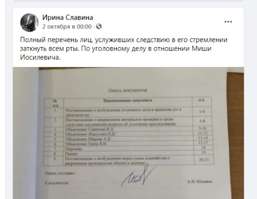 Помимо журналистики, довольно острой, но явно не запредельной, Ирина Славина ещё активно включилась в политику и, сочетая и то, и другое, умудрилась привлечь к себе пристальное внимание правоохранительных органов. Настолько пристальное, что, надо полагать, походы в суд и общение с полицией должны были стать для неё привычными. Тем более, что фигурантом по многим из этих разбирательств является небезызвестная "Открытая Россия", проект Михаила Ходорковского. И вот, 1 октября 2020 в её квартире происходит обыск и изъятие нескольких электронных устройств, могущих содержать сведения по уголовному делу в отношении Михаила Иосилевича. Мероприятие не особо приятное для обеих сторон, но никак не экстраординарное. В ночь на 2 октября 2020 года Славина публикует на странице в Facebook**** пост, в котором копия некоей описи документов, подписанной следователем.