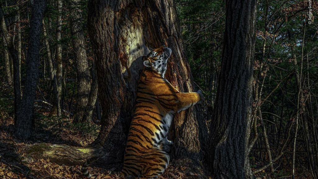 Отмечается, что герцогиня Кембриджская объявила этот снимок победителем престижного конкурса, на который было подано более 49 тысяч работ. Россия впервые стала победителем в номинации этого конкурса. Фотография под названием "Объятия" показывает момент, когда амурский тигр "обнимает" ствол пихты, чтобы оставить на меточном дереве свой запах.