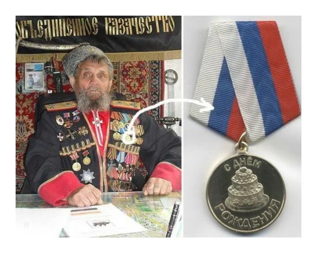 Нынешние казаки совсем не похожи на тех людей, за которых они себя выдают. Прежде всего их отличает «иконостас» медалей и орденов непонятного происхождения. Хотя если приглядеться внимательнее, серьезные с виду бородатые мужчины не стесняются вешать на себя медали «С днем рождения», «Именины» и тому подобные. Хотя есть и более интересные образцы.