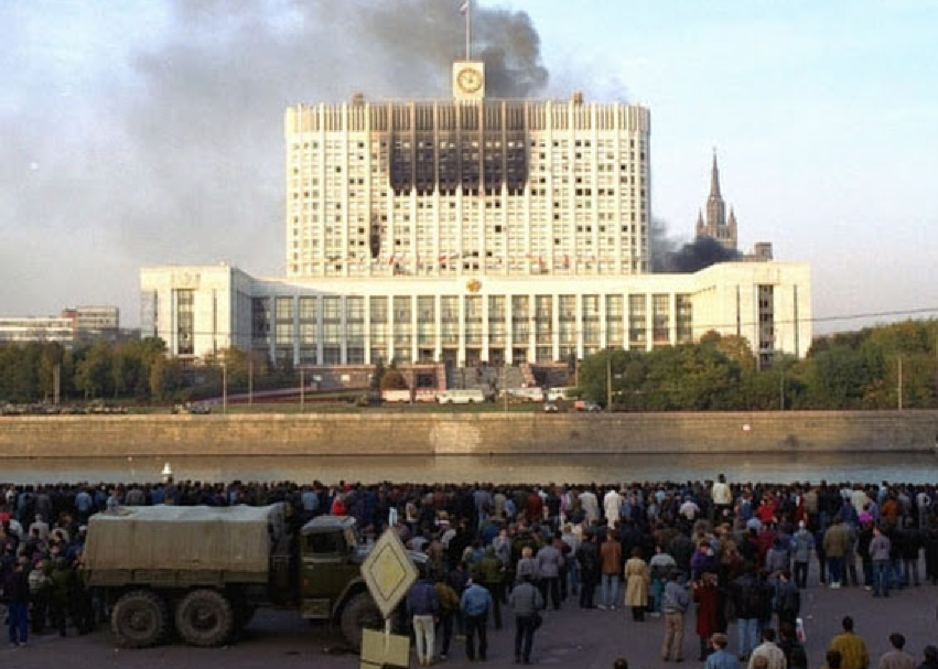 21 сентября 1993 года Ельциным совершен государственный переворот, напоминающий переворот, устроенный в Чили в 1973-м году Пиночетом, с расстрелом парламента и массовыми жертвами. Ещё с сентября 1993 года Ельцин объезжал военные части, подкупал военных, повышал им зарплату-это доказывает тот факт, что переворот планировался заранее. Был законный орган власти-депутаты, их недавно выбрал народ