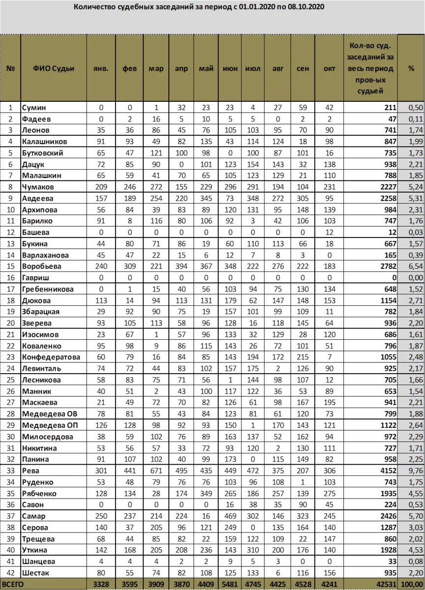 В таблице, приведенной ниже, указано количество судебных заседаний первой инстанции, проведенных конкретным судьей в 2020 году.