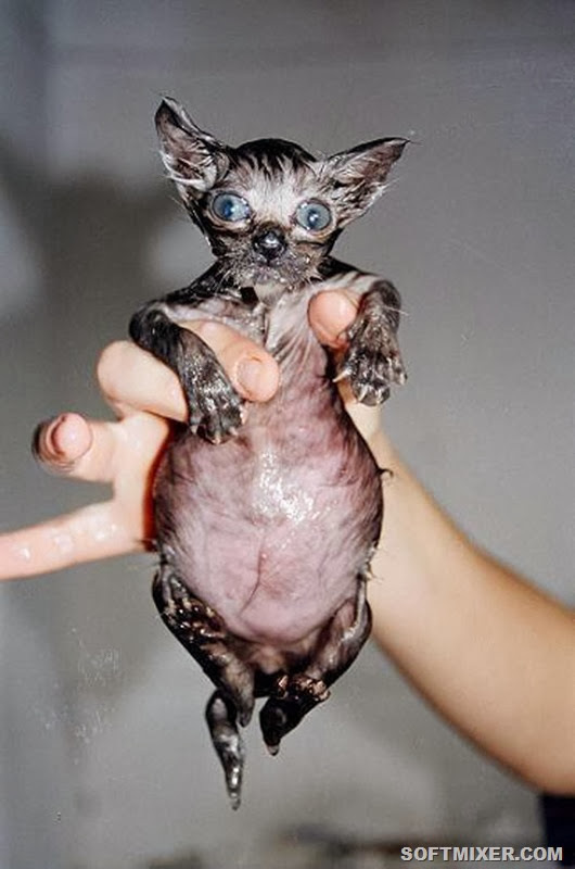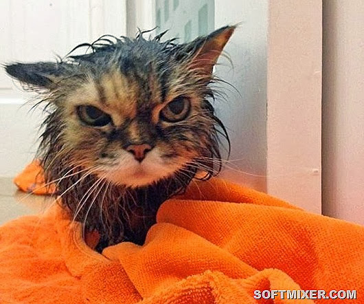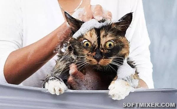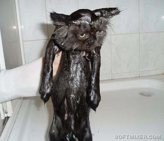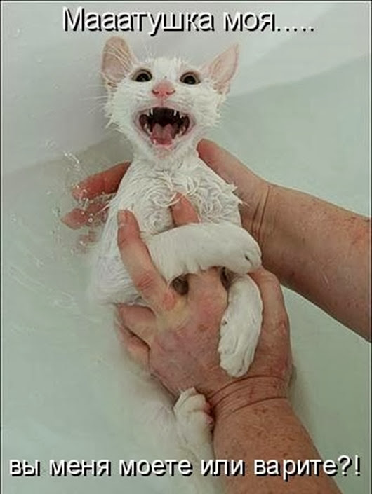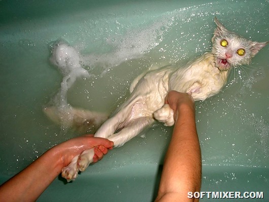У кошек нет места, за которое их было бы удобно держать. Добавьте к этому мыльный мех, чтобы понять, сколь сложна проблема. Не думайте, что вам удастся удержать кота более трех секунд. За это время вы должны вылить на него очередную порцию шампуня и скрести его в бешеном темпе. Вырвавшись, кот упадет в воду, тем самым, смывая с себя мыло. Попытки с третьей, кот выскочит из ванны, поэтому не стоит рассчитывать, что он себя хорошо ополоснет, так что под конец, придется помочь ему в этом.