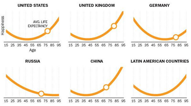 В США график идет сверху вниз, низшая точка примерно 47 лет. На отметке 55 лет кривая снова уходит наверх — проблемы среднего возраста позади, человек осознает свое место в мире и понимает, что еще есть время насладиться жизнью.