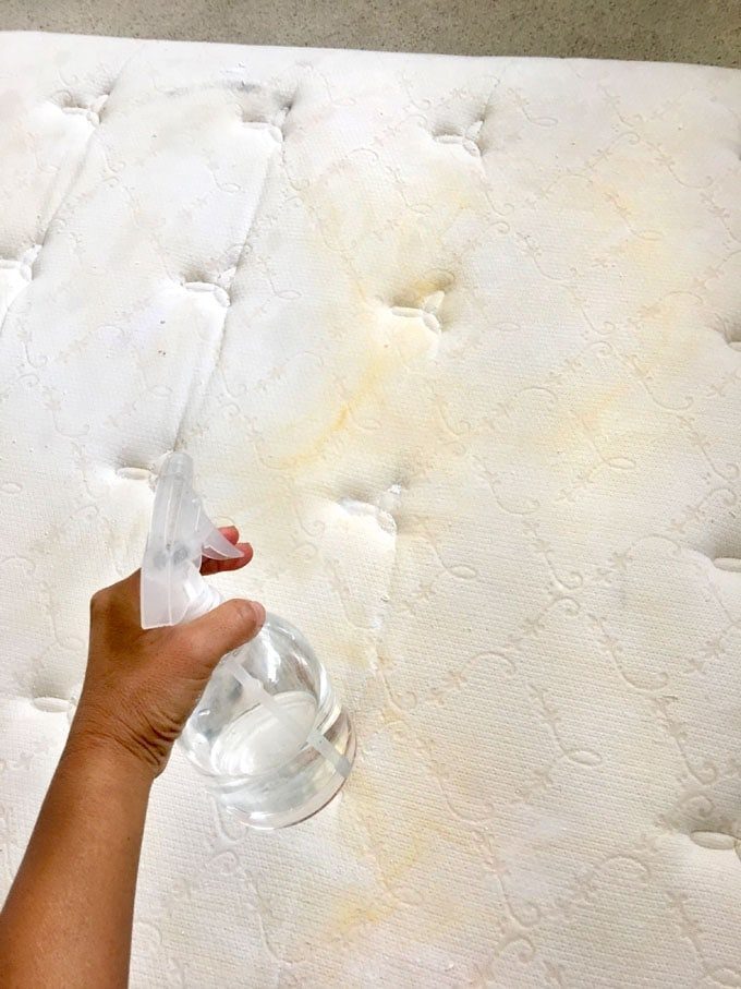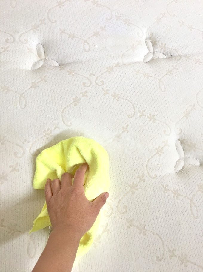 Наполните чуть не полную бутылку водой, добавьте чайную ложку средства для мытья посуды. Как следует взболтайте и распылите жидкость на матрас. Важно, равномерно покрыть его жидкостью, чтобы сухих мест не осталось. Работайтя нужно быстро.