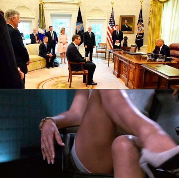 В Facebook**** представитель МИД разместила коллаж: фото со встречи Вучича с Трампом она совместила со знаменитым кадром из фильма «Основной инстинкт». Таким образом Захарова сравнила позу сербского лидера, который сидел на стуле лицом Трампу, с допросом героини Шэрон Стоун. «Если вас позвали в Белый дом, а стул поставили так, будто вы на допросе, садитесь как на фото #2. Кем бы вы ни были. Просто поверьте», — говорилось в посте. В «Основном инстинкте» героиня Стоун во время допроса сидит на стуле и держит одну ногу на другой, а затем меняет их местами, оголяя при этом половые органы.