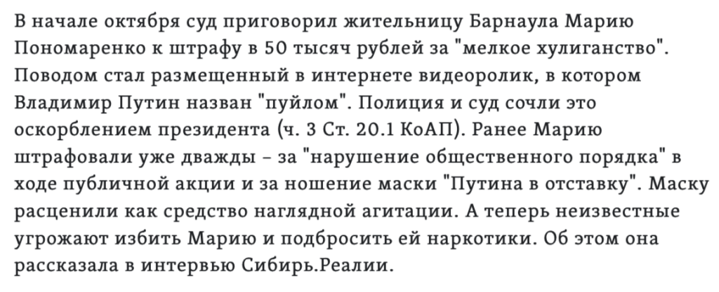 А я лично поддерживаю Марию Пономаренко в борьбе за справедливость, но против оскорблений в адрес президента РФ, несмотря на то, что я сама не доверяю Владимиру Владимировичу! И всё же, дай бог ей сил и терпения, чтобы справиться с этим прессингом местных властей!