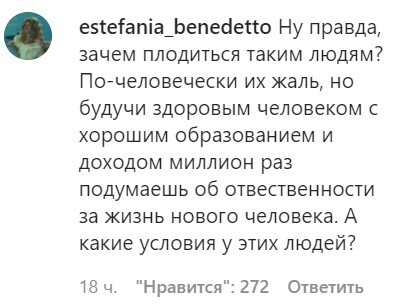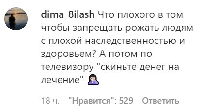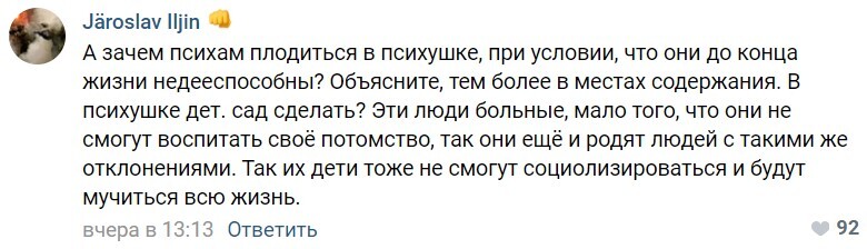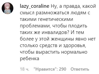 Но больше всего меня удивило даже не то, что подобное возможно в России, а комменты к моему посту. Оказывается, многие искренне считают, что инвалидов надо массово стерилизовать, чтобы не навредить генофонду.