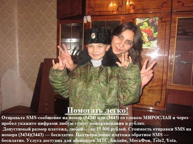 Друзья не проходите мимо, ваше участие в виде перепоста и поставить класс приветствуется. Это, тоже ваша помощь! В результате взрыва гранаты РГД-5 в городе Артемовск-ЛНР, что расположен на западе Луганской Народной Республики, тяжелые ранения получил семилетний мальчик. Мама мальчика Казачка защитник ЛНР участница боевых действий в составе ополчения в 2014 году. Участница Дебальцевской операции 2015 года. Одна воспитывает троих детей... Спасибо врачам Луганска, при поддержке администрации ЛНР семье и медикам, Мирослав выжил, после операции, но сейчас семья с тремя детьми остро нуждается в продуктах, медикаментах и перевязочных материалах. Мирослав стойко переносит страдания и держится, как настоящий казак. Прошу помочь, этой семье, чем сможете. Я, и сам постараюсь сделать, для них что смогу... Помогать легко! Отправьте SMS-сообщение на номер (3434) или (3443) со словом МИРОСЛАВ и через пробел укажите цифрами любую сумму пожертвования в рублях. Допустимый размер платежа, любой — до 15 000 рублей. Стоимость отправки SMS на номера (3434) (3443) — бесплатно. Подтверждение платежа обратное SMS — бесплатно. Услуга доступна для абонентов МТС, Билайн, МегаФон, Tele2, Yota.