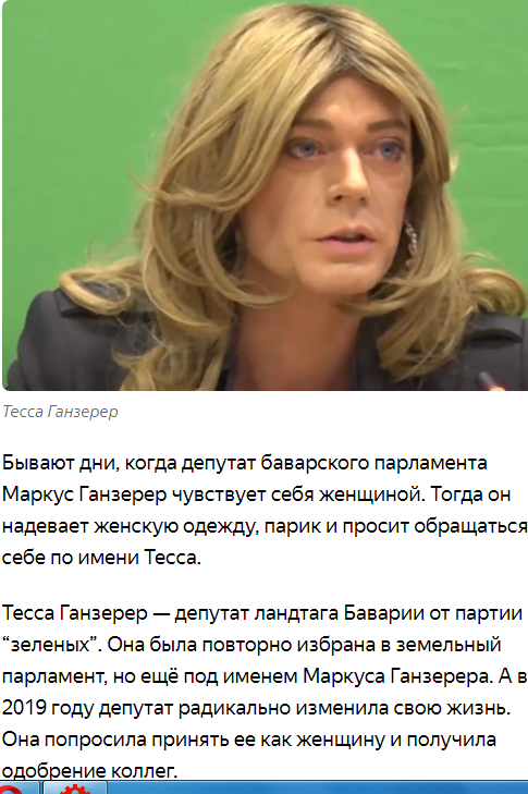 Так вам пора в ту же палату, вместо Мизулиной. В нормальной стране трансгендер без мозгов не будет ничем заправлять, да и зачем ему. Помимо этого на протяжении всех веков примерный процент трансов, геев и лесбиянок не менялся. Так что ваша шизофрения по поводу того, что если такие будут у власти, то все такими станут, неуместна. Будучи за рубежом таких личностей я встречал не больше, чем в России. Хотя в России это большее отклонение, так как европейцам для самовыражения так себя менять не нужно. В России это именно клиника. Клиника, в которой первый пациент именно Мизулина, так как на старуху она смахивает едва ли. Скорее на психопата в юбке. А если у вас фобия перед трансами - которые не глупее вас будут, как бы это не выглядело, то вам точно надо лечиться. Ориентация приобретается с рождения, а вот ваша болезнь лечится.