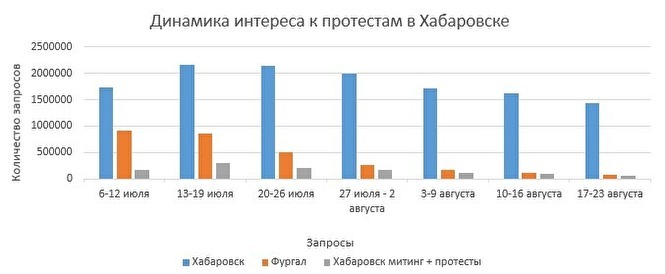 Активнее всего пользователи интересовались митингами и протестами в Хабаровске с 13 по 19 июля, спустя неделю после ареста Фургала. Тогда в городе прошли самые массовые акции и шествия, численность которых протестующие оценивали до 100 тыс. человек. Суммарно информацию по запросам «Хабаровск митинг» и «Хабаровск протесты» искали 298 тыс. раз. После этого показатель еженедельно снижался: на следующей неделе темой интересовались 213 тыс. раз, еще через неделю пользователи сделали 173 тыс. запросов. На прошлой неделе, с 17 по 23 августа, эти запросы отправили 53,9 тыс. раз.