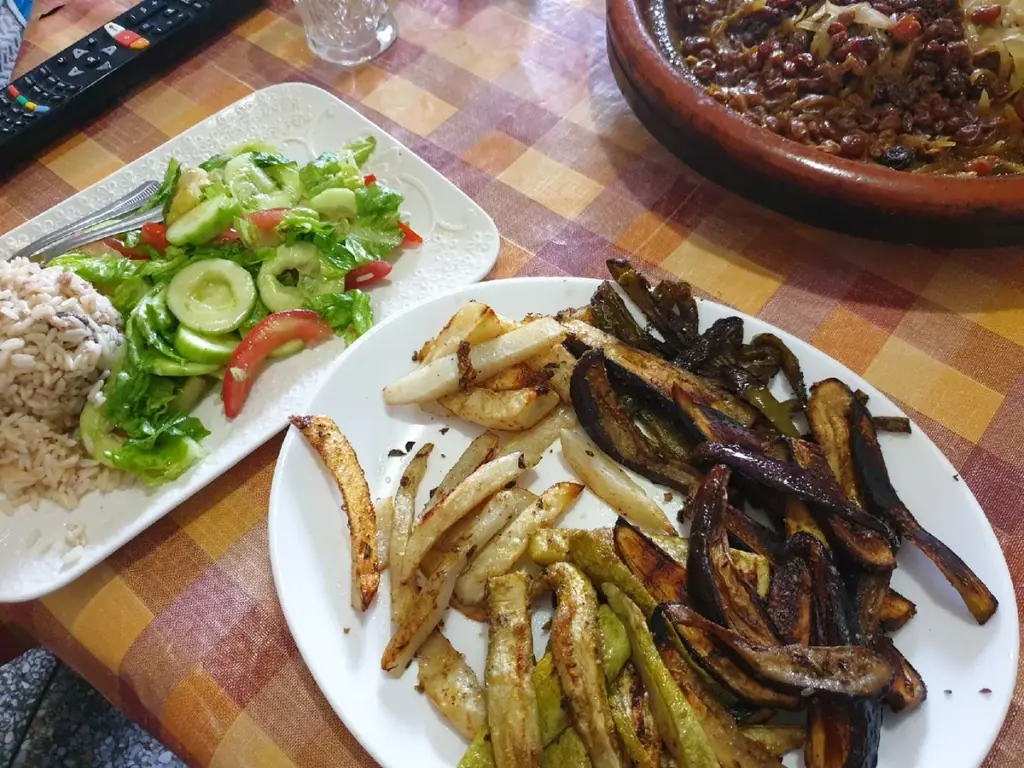 На закуску были картошка-фри и запеченные овощи. Салат обычный овощной, а также рис с туном. Тун - это такие местные консервы, их часто добавляют в салаты и пиццу. И все это заправлено оливковым маслом. Вот такое необычное сочетание.