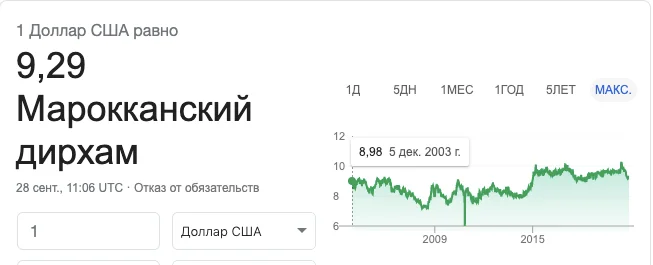 Марокканский дирхам одна из самых стабильных валют по отношению к доллару. Посмотрите сами на график. С 2003 года курс практически не меняется. Колебания хоть и есть, но они незначительные и составляют 1-2 дирхама.