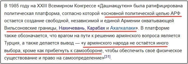 У армянского народа не остаётся иного выбора, кроме как прибегнуть к самообороне, чтобы обеспечить своё физическое существование и право на самоопределение» — это что предсказание будущего? О какой самообороне и праве на самоопределение идет речь в 1985 году? Когда еще Союз был Союзом, а центробежными процессами и не пахло?