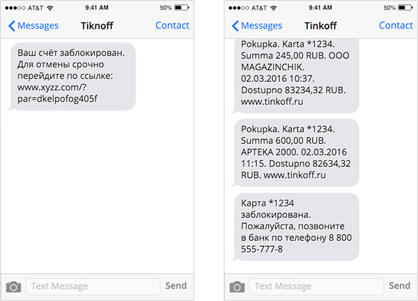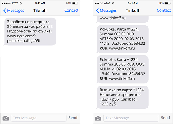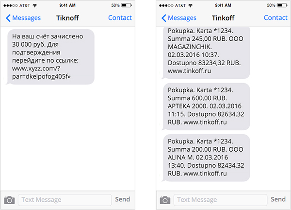 Мошенники часто регистрируют адреса, похожие на названия банков. Тут работает свойство мозга, который считывает слова, где отсутствует буква, или буквы переставлены местами, придавая ему знакомый смысл. (Обратите внимание, как подписаны отправители SMS). Когда приходит новое сообщение с подобным отличием, то оно отображается в новой переписке.