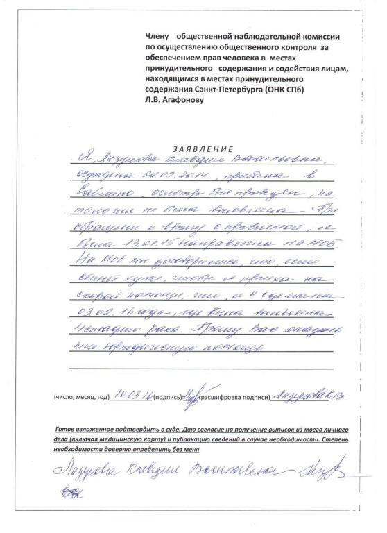 «Я, Лизунова Клавдия Васильевна, осуждена 24.02.2014, прибыла в Саблино, осмотр был проведен, но патология не была выявлена. При обращении к врачу с проблемой я была 13.01. 15 направлена на МОБ (межобластную больницу в системе ФСИН, в данном случае в больницу им. Гааза. — Ред.). На МОБ мы договорились, что если станет хуже, чтобы я приехала на «скорой помощи», что я и сделала 03.02.16 года, где была выявлена 4 стадия рака. Прошу Вас оказать мне юридическую помощь».