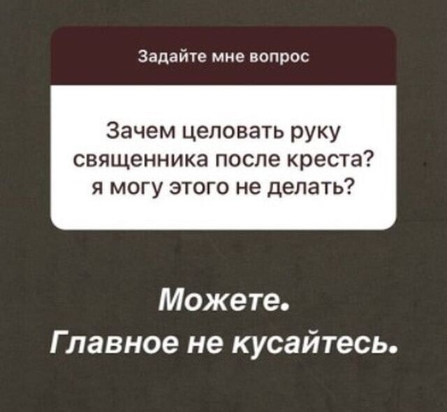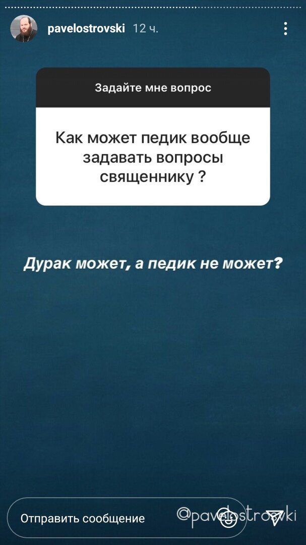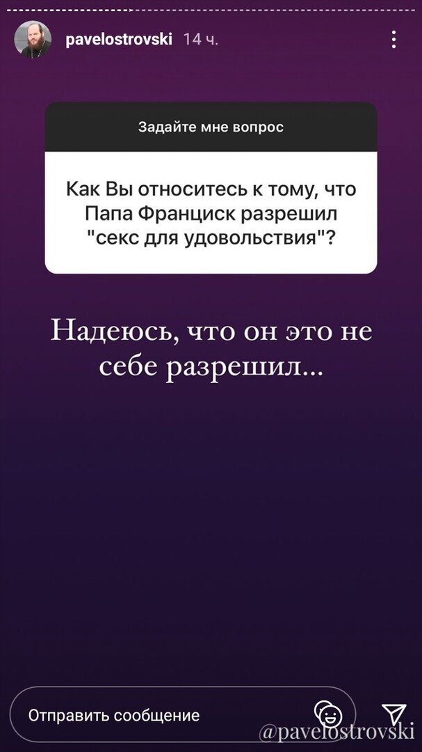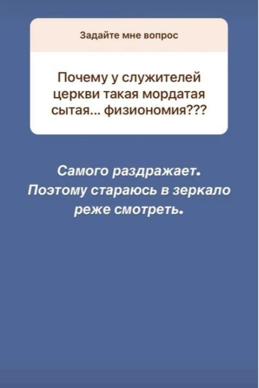 ----- что то мне подсказывает что и этот инстаграмный батюшка не из тех единиц)))) а напоминает мне чем то того с которым по работе сталкивался. Я помню что заговорили за какой то праздник и тот поп так сказал типа снять проституток и хорошо в баньке отдохнуть (я тогда в первые удивился что можно такое услышать от "служителей церкви"), а потом позже всплыло что попал этот "горе-служащий" на таком случае с прихожанкой)))))