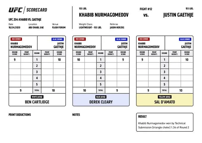 Лишь один судья – Дерек Клири – признал стартовую пятиминутку за Хабибом, 10-9. Два других арбитра – Бен Картлидж и Сэл Д’Амато – посчитали, что первый раунд выиграл Джастин. Они отдали американцу по 10 баллов, Хабиб получил от Бена и Сэла по 9 очков.