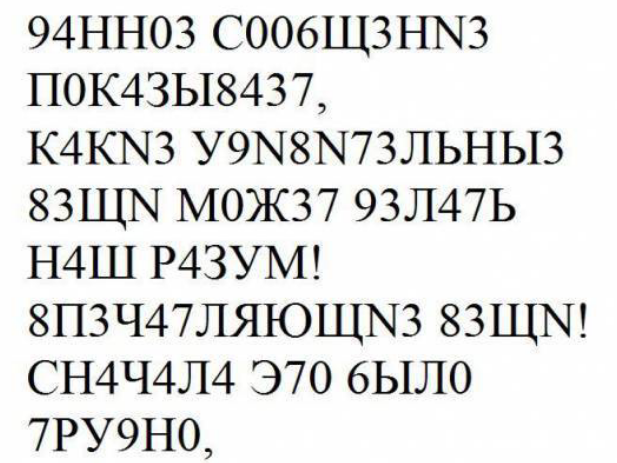 По рзеузльаттам илссоевадний одонго анлигсйокго унвиертисета, не иеемт занчнеия, в каокм проякде рсапжоолены бкувы в солве. Галовне, чотбы преавя и пслонедяя бквуы блыи на мсете. Осатьлыне бкувы мгоут селдовтаь в плоонм бсепордяке, все-рвано ткест чтаитсея без побрелм. Пичрионй эгото ялвятеся то, что мы не чиаетм кдаужю бкуву по отдльенотси, а все солво цлиеком.))))) цифры: используются в качестве букв по сходству начертания с буквами или первому звуку в названии цифры.