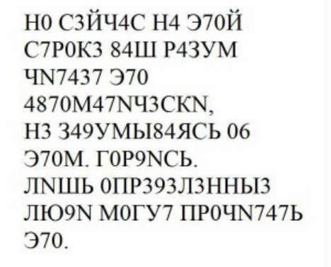 Данное сообщение показывает, какие универсальные вещи, может делать наш разум. Впечатляющие вещи! Сначала это было трудно. Но сейчас на этой строке ваш разум читает это автоматически, не задумываясь об этом. Гордясь. Лишь определённые люди могут прочитать это.