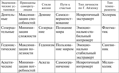 По соответствию между эвдемоническими установками и характеристиками поведения и темперамента личности выделяется типология стилей жизни (А.Кронин, Р.Ахмеров, 2003 г.): деятельность, созерцание, гедонизм и аскеза.