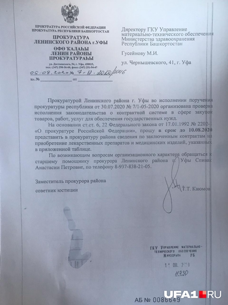 Прокуратура республики действительно занялась данным вопросом. Так, зампрокурора Ленинского района еще в начале августа обратился в Минздрав Башкирии с требованием предоставить сведения по заключенным контрактам на приобретение лекарственных препаратов и медицинских изделий. Однако известно об этом стало лишь в первой декаде октября.